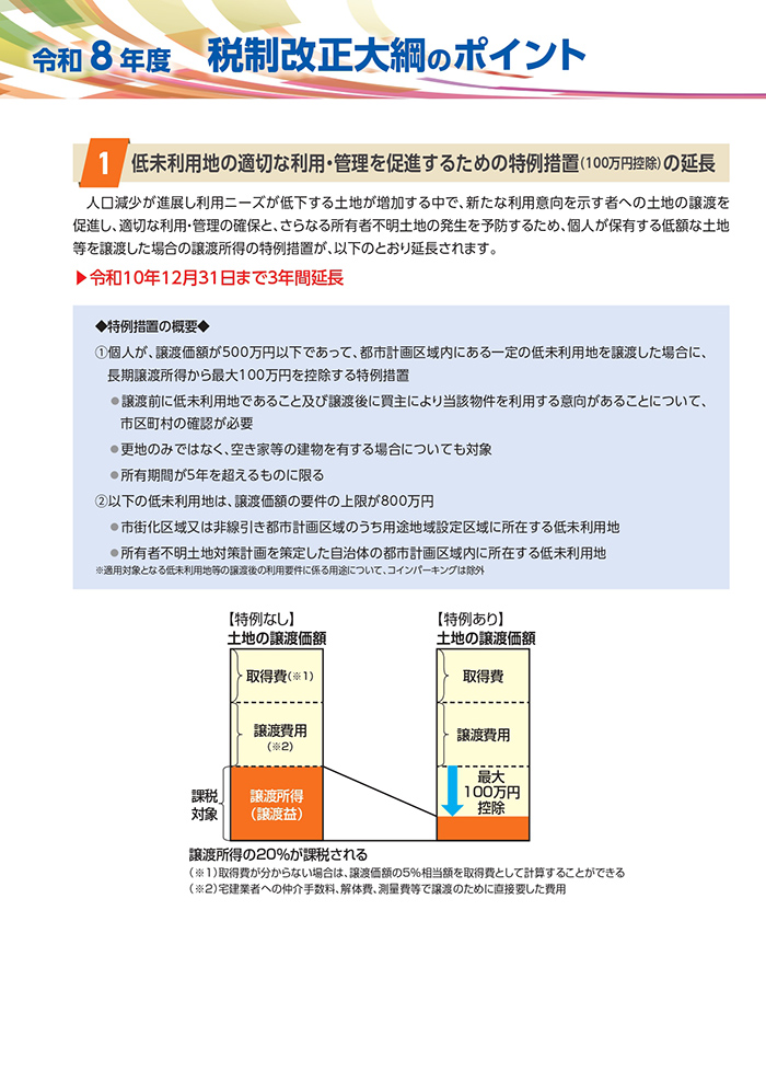 令和7年度税制改正大綱の「低未利用地の適切な利用・管理を促進するための特例措置(100万円控除)の延長」では下記内容についてご紹介しています。