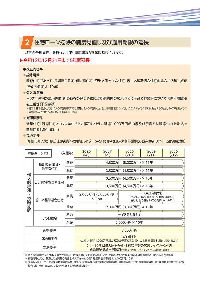 令和8年度税制改正大綱の「ポイント2 住宅ローン控除の制度見直し及び適用期限の延長」では下記内容についてご紹介しています。