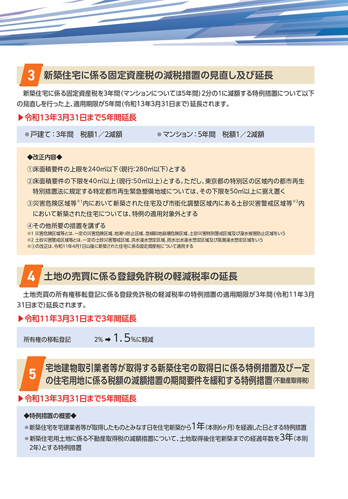 • 新築住宅用土地に係る不動産取得税の減額措置について、土地取得後住宅新築までの経過年数を3年(本則2年)とする特例措置